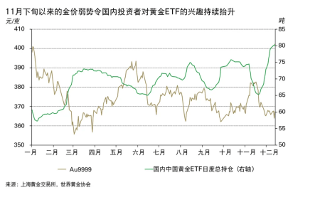 或许是由于11月下半月金价的疲软,投资者重拾对黄金ETF的投资兴趣。由于金价的相对低位持续,国内投资者不断以低价入市,12月中国的黄金ETF总规模不断上升,截至12月16日,其总持仓已超过80吨,为历史最高。